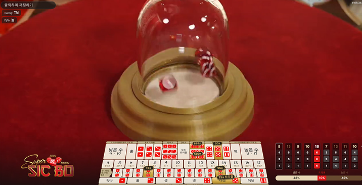 식보(Sic Bo)는 세 개의 주사위를 굴려 결과를 예측하는 전통적인 라이브 카지노 테이블 게임입니다.