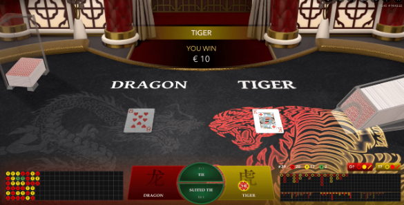 왼쪽의 ‘용(Dragon)’, 오른쪽의 ‘호(Tiger)’ 자리에 각각 한 장씩 카드가 오픈되며, 더 높은 숫자의 카드가 승리합니다.