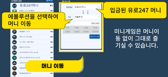 상단 메뉴의 ‘머니 이동’ 버튼을 이용하면, 에볼루션 게임으로의 자금 이동이 단 1초 만에 가능하며, 슬롯/스포츠/그래프 등 다른 게임 간 이동도 자유롭습니다.
