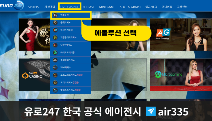 유로247에서 에볼루션 카지노로 금액 이동을 완료했다면, 상단 메뉴에서 ‘라이브’ → ‘에볼루션 카지노’를 선택하세요.